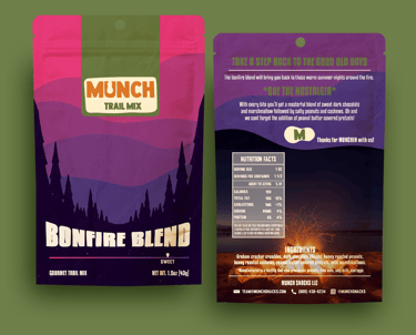 A vibrant, in your face trail mix package, designed to capture the essence of outdoor adventures and the warmth of a cozy bonfire. Bursting with striking colors, this eye-catching packaging invites you to explore the rich, sweet and smoky flavor that evokes the spirit of gatherings under starry skies.
