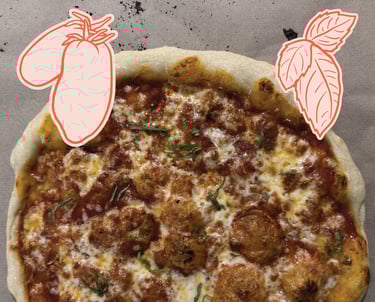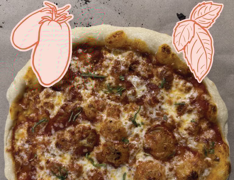 The pizza dough label showcases a hand holding a pizza peel, reinforcing the craft behind the product. Set in Baker’s Blue with the illustration as a focal point, the label balances bold contrast with the approachable, organic style of the brand.