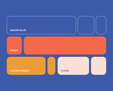 The color palette balances contrast and warmth through a mix of bold and familiar tones. Baker’s Blue provides a deep, grounded base, while Peach adds high contrast energy and visibility. Golden Wheat brings warmth and nods to the core ingredient. Everything is tied together with a soft Flour White, a light peach leaning neutral that keeps the palette approachable and cohesive.