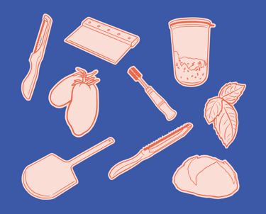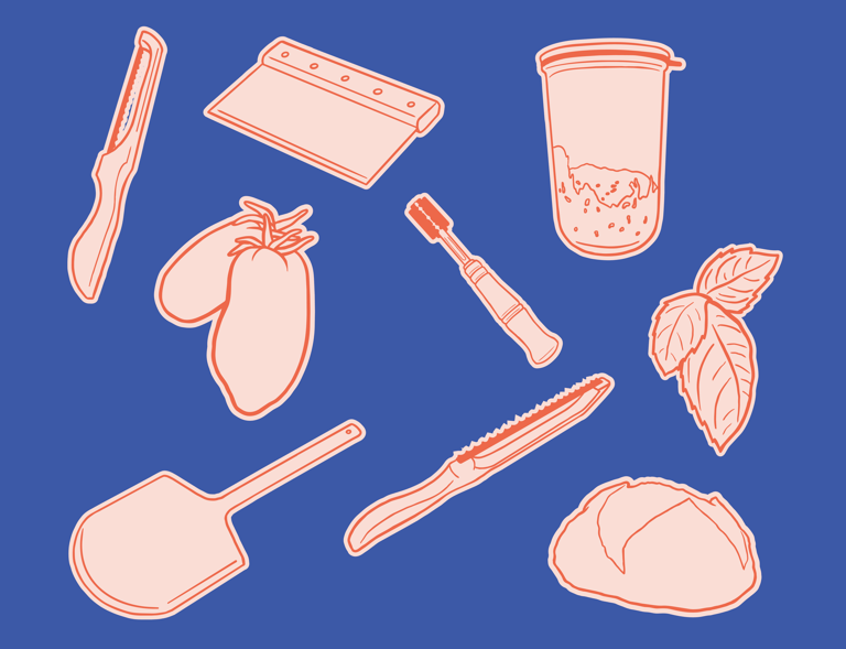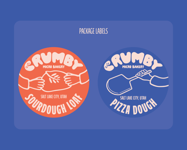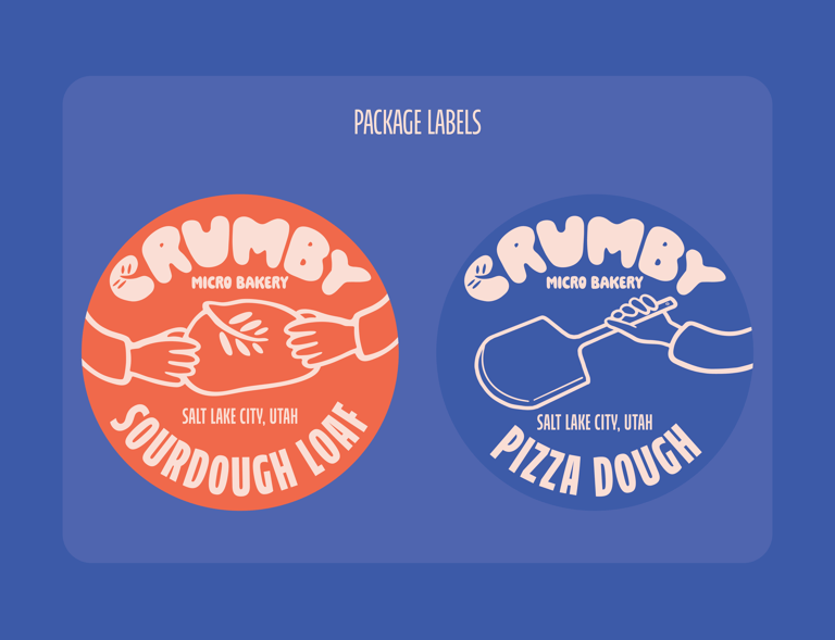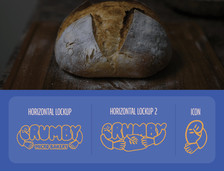 The illustrations highlight the tools and ingredients behind Crumby’s craft. Two items are emphasized as the stars of the brand: freshly baked sourdough bread and sourdough pizza dough. Each illustration is drawn with a simple, organic style, reinforcing the handmade, approachable nature of the products while celebrating the process and care behind them.