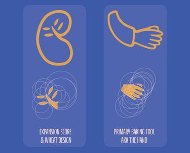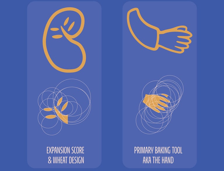 This logo combines two familiar elements of sourdough: the expansion score and the baker’s hand. The score, paired with a simple wheat detail, is shaped into the letter “C" grounding the mark in both process and product. An organically illustrated hand surrounds the mark, holding the elements together and emphasizing the hands-on nature of the process. The result is a straightforward, functional mark rooted in real breadmaking.