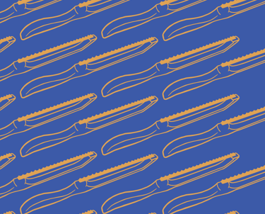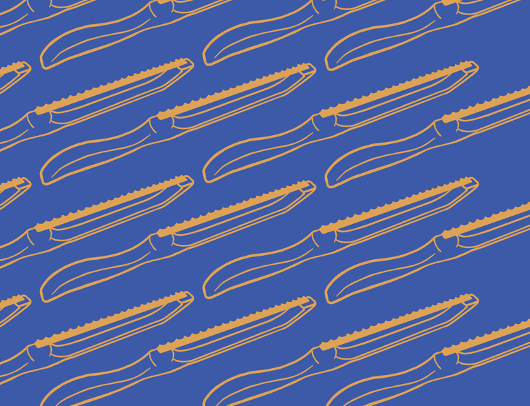 The pattern uses the bread knife illustration repeated to create a bold, textural background. Its simple, organic line work adds visual interest while reinforcing the handmade, artisanal nature of the brand without overwhelming the design.