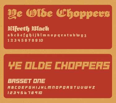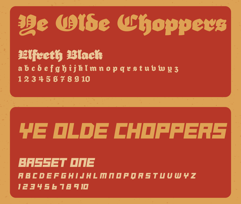 Big, heavy type in an old english style to encapsulate the region as well as the bold boundary pushing craftsmanship of building motorcycles. This is paired with a slightly less bold, easier to read sans serif font.